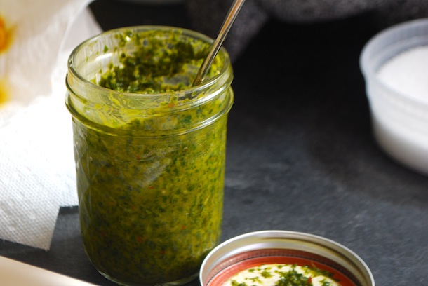 I’m all about having a couple of go-to, simple sauces that transform basic meals. Chimichurri is one of those sauces. Designed as a topper for grilled meats, it can also be used as a dip, dressing, or marinade. The chimichurri I’m whipping up this week is topping off roasted chicken drumsticks that I’ve seasoned with olive oil, salt, pepper and garlic powder. Make this chimichurri your own by swapping out whatever fresh green herbs you have, amping up the chile heat, changing the vinegar, or using citrus juice. If you can find the white balsamic that I use from Trader Joes, you’ll enjoy the slightly sweet but clean flavor. Make a big batch, you can store it in your fridge for about a week in a sealed container.