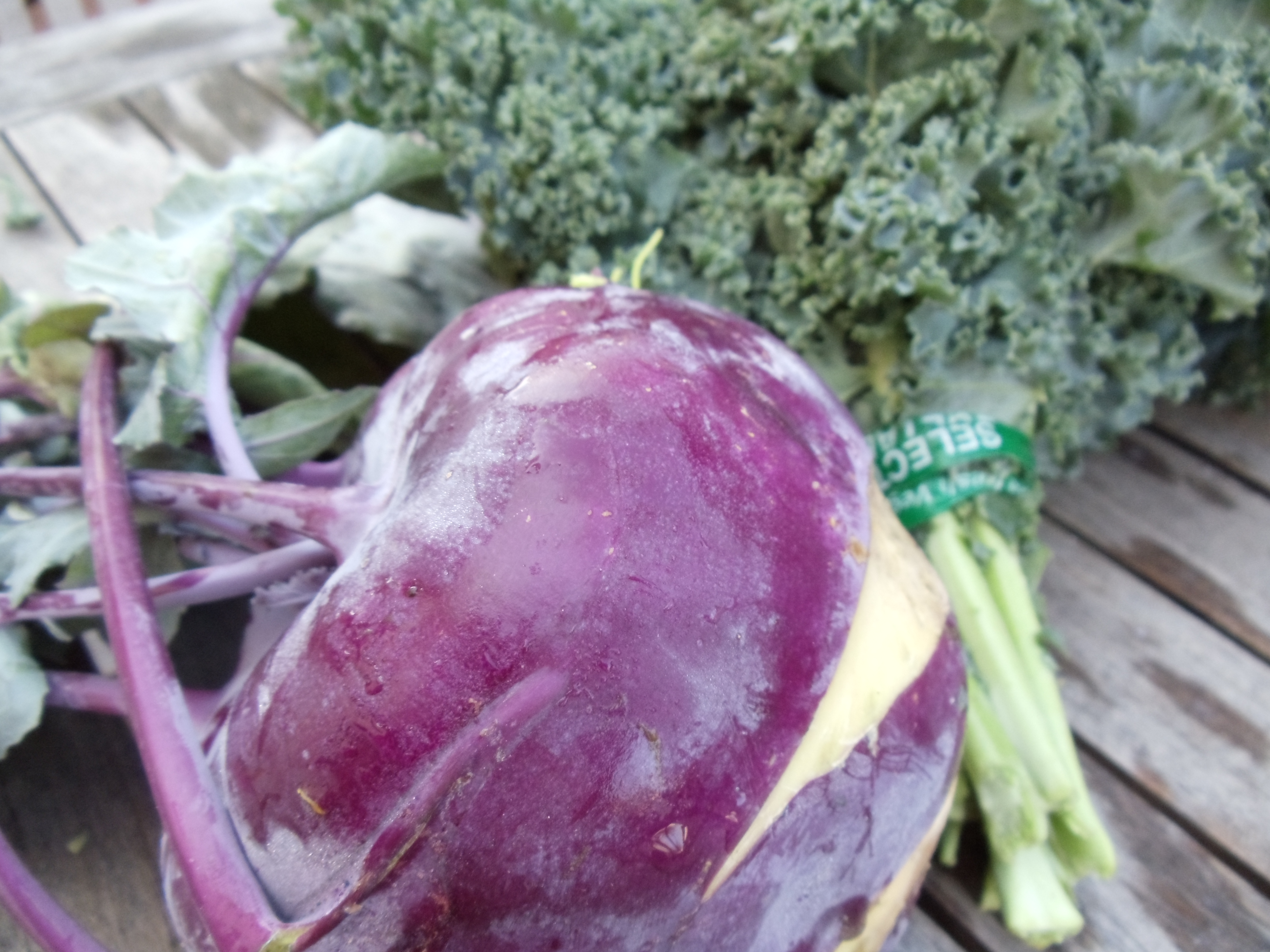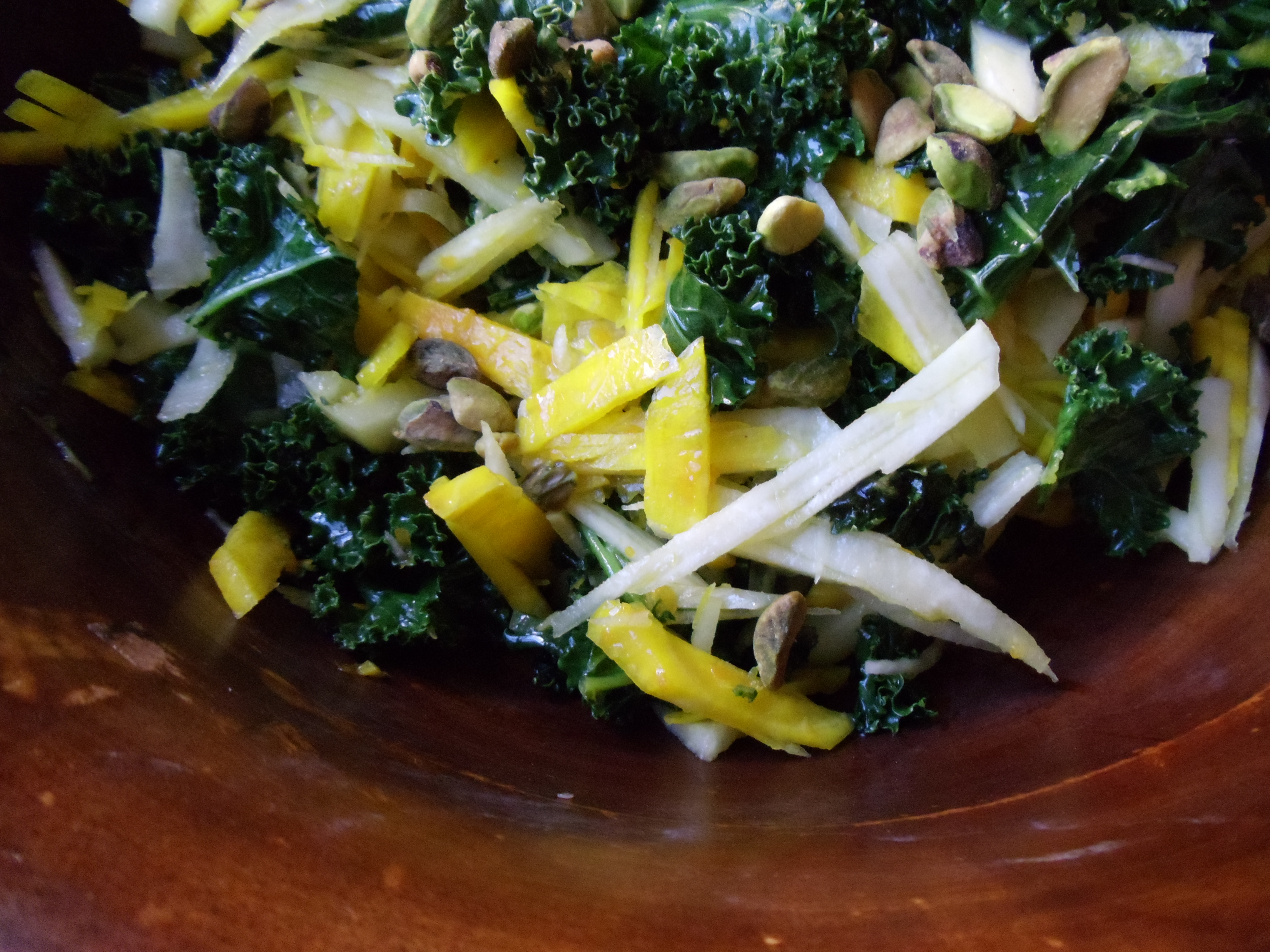 A Tanaka Farms fan had posted an idea to use kale and the ever-puzzling kohlrabi together in a combo of raw and cooked, crisp and savory. The Epicurious.com recipe was pumped up with lots of zingy lime and luscious pistachios, and I tweeked it a bit with a bit of orange and shredded golden beets from the weekly farm box, and ended up with a crunchy and satisfying lunch. This dish could accompany a grilled protein, or become a meatless main course by folding in a bit of steamed quinoa.