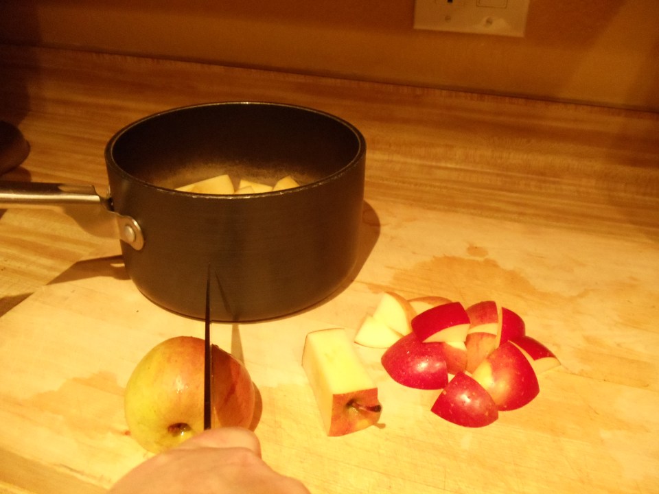 ← Previous Next → Cut apples away from core into chunks Cut apples away from the core, then into chunks.