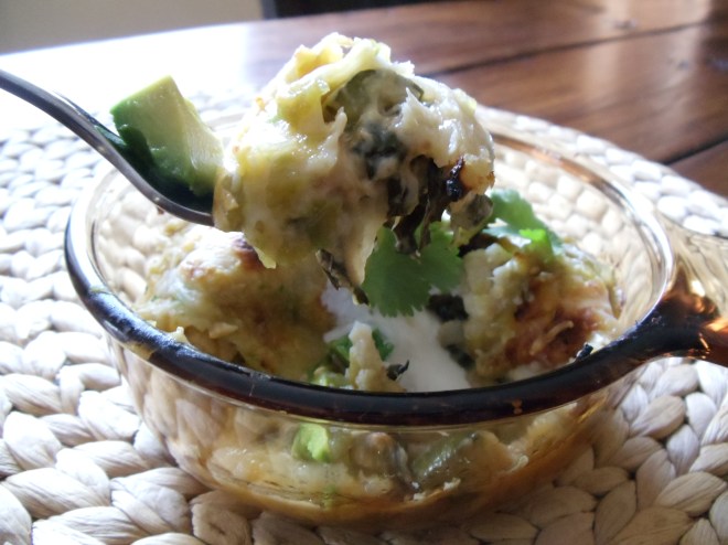 Heat the oven to 350 degrees, and prepare a casserole dish (11″ x 7″) with two tablespoons of tomatillo salsa spread around the bottom. Turn on a gas burner, and place a tortilla on the open flame. Cook until slightly charred, about 30 seconds, then flip over, using tongs, and cook for an additional 30 seconds. Add 3-4 heaping tablespoons of the vegetable mixture to the center of the tortilla, wrap the sides around the mixture, then place in the casserole dish, seam side down. Continue to toast and fill the tortillas, nestling them closely in the dish until all are filled and folded. You may have additional mixture left over, which can be sprinkled on top of the tortillas. Pour the remaining tomatillo salsa over the top and sprinkle the remaining cheese.