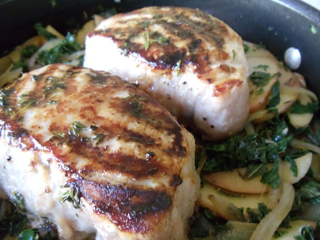 For the saute: Melt butter or heat olive oil in a large skillet set at medium-high heat. Add the onions and cook until they start to brown, then lower heat and continue to cook until the onions caramelize, turning a golden brown, about 10 minutes. Add the garlic and apples, and cook until apples soften, then add the kale and cook while stirring until kale turns vivid green. Add vinegar and maple syrup, season with salt and pepper, and stir to combine. Serve with the slice pork chops.