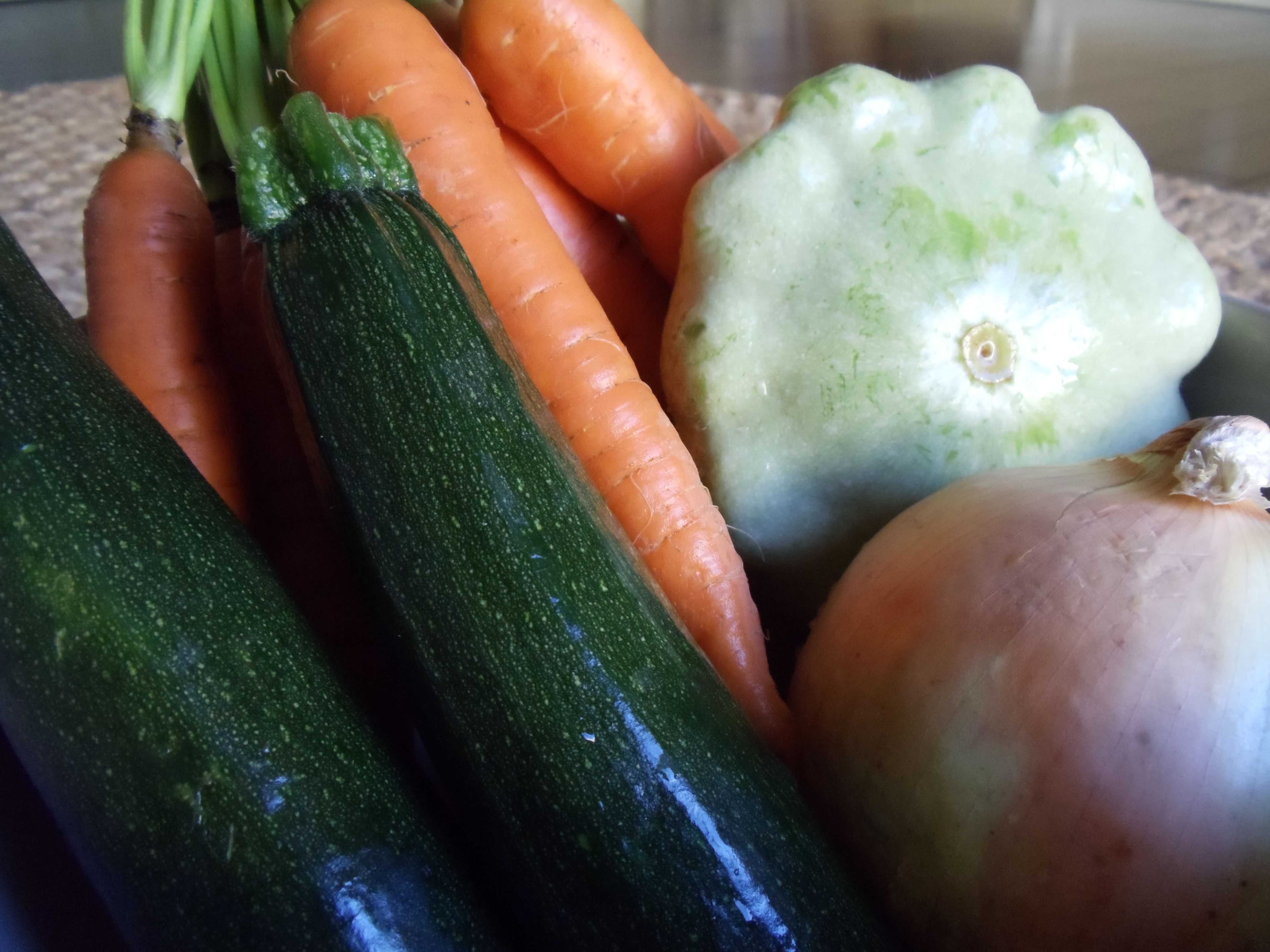 This week I started with carrots, zucchini, patty pan squash and stunning rainbow chard from my farm box. I sauteed these up with Trader Joes sweet Italian chicken sausage for some robust flavor without much fat, and added white beans to give the soup a solid protein base. Serve this soup with some homey, warm bread spread with herbed ricotta (a cup of ricotta cheese, a tablespoon of chopped fresh herbs, a hit of extra-virgin olive oil, a pinch of sea salt and a crank of freshly ground pepper.)