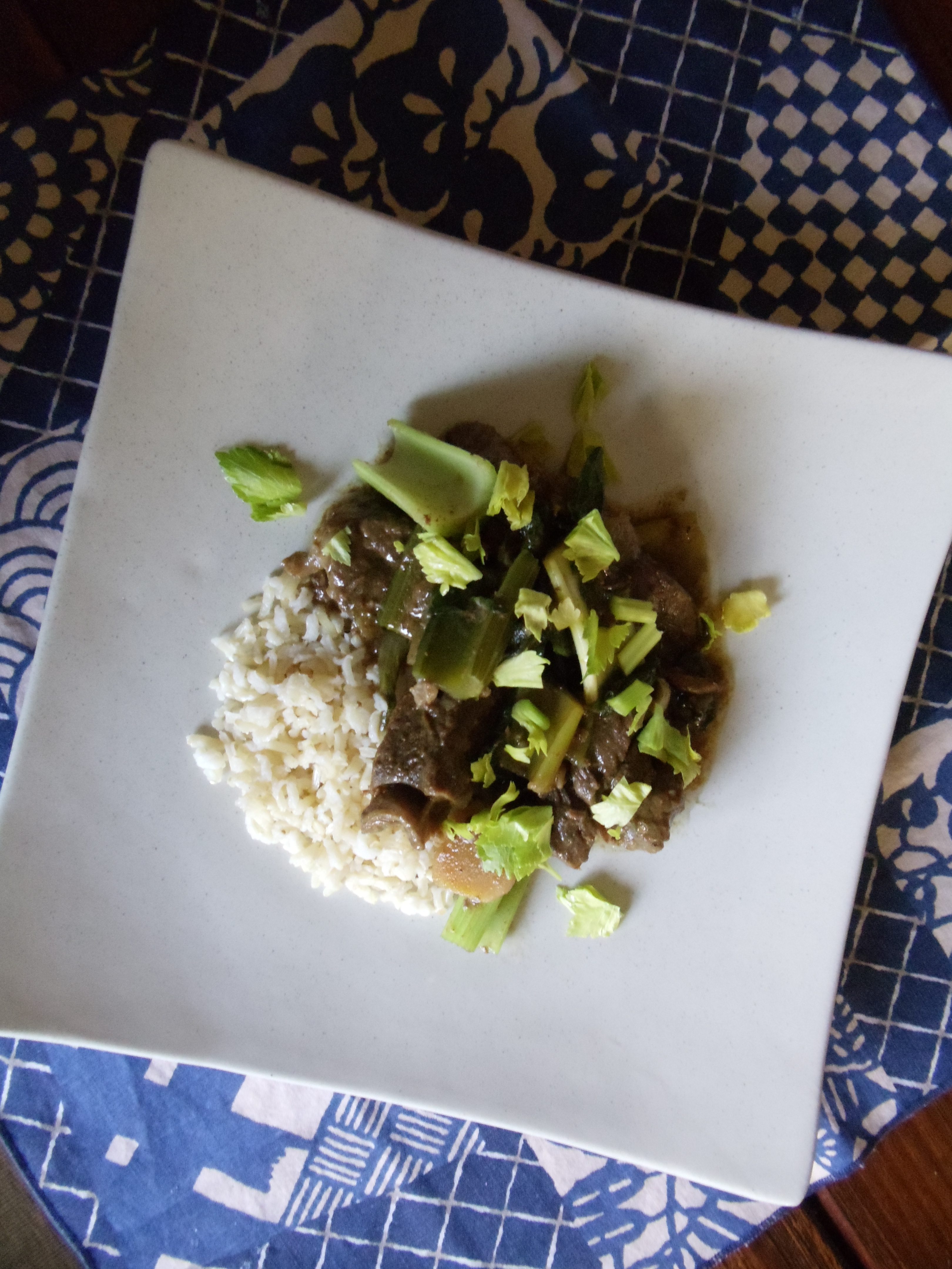 Remove the meat from the refrigerator and skim the chilled fat off of the top. Heat over low heat until warmed through. In a large skillet, heat enough vegetable oil to coat the bottom of the pan, then add the celery and bok choy. Sear the vegetables very quickly, about 2 minutes, until they are a vibrant green, then pour a dash of soy sauce over them. Cook until the soy sauce has coated the vegetables, and then add them into the beef stew. Put the cornstarch in a bowl and whisk in a 1/2 cup of cooking liquid, then whisk it into the stew, cover and let simmer for 2 minutes.