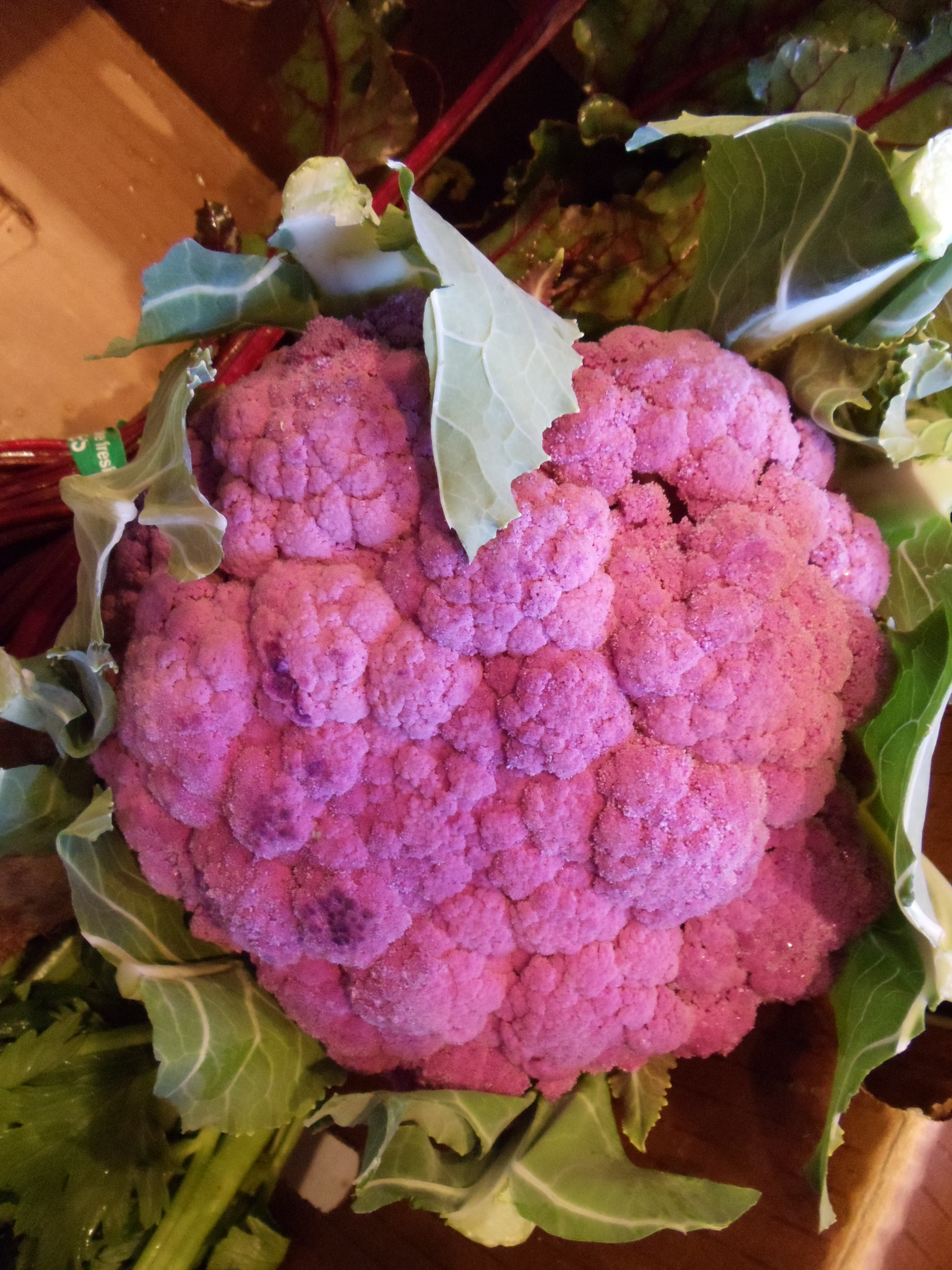 How could you not revel in the glory of this purple cauliflower? I was so excited to have an opportunity to be so creative this round. With Satsuma tangerines, carrots, romaine lettuce, kale, beets, bok choy, spinach, celery and purple cauliflower, avocado, along with some goodies from the farmer’s market, including Meyer lemons, baby artichokes, Japanese yams, butternut squash, and jalapenos, I prepared: