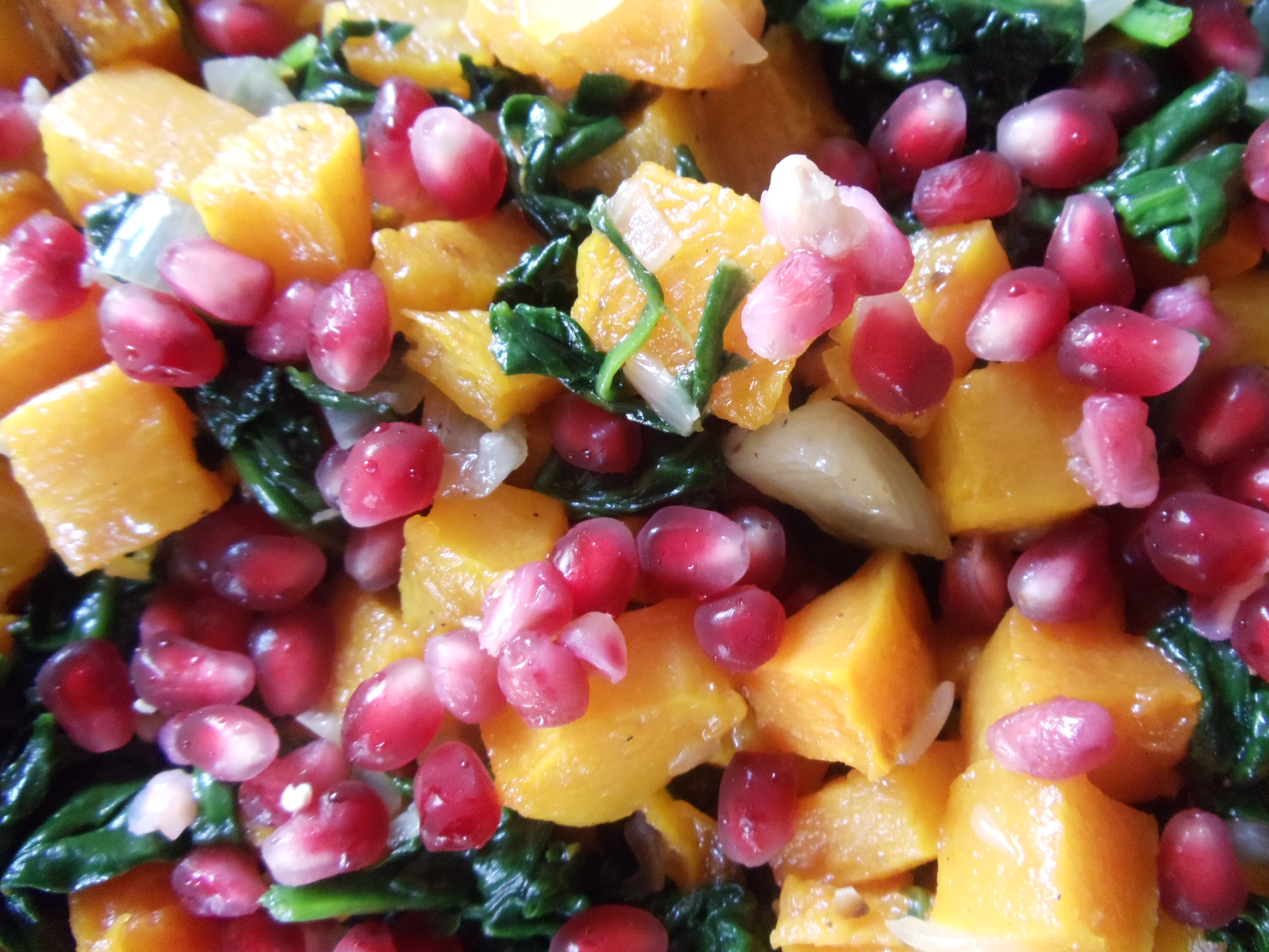 Distribute the spinach mixture on top of the squash and return to oven until the squash and spinach are heated through. Sprinkle pomegranate seeds on top and serve.