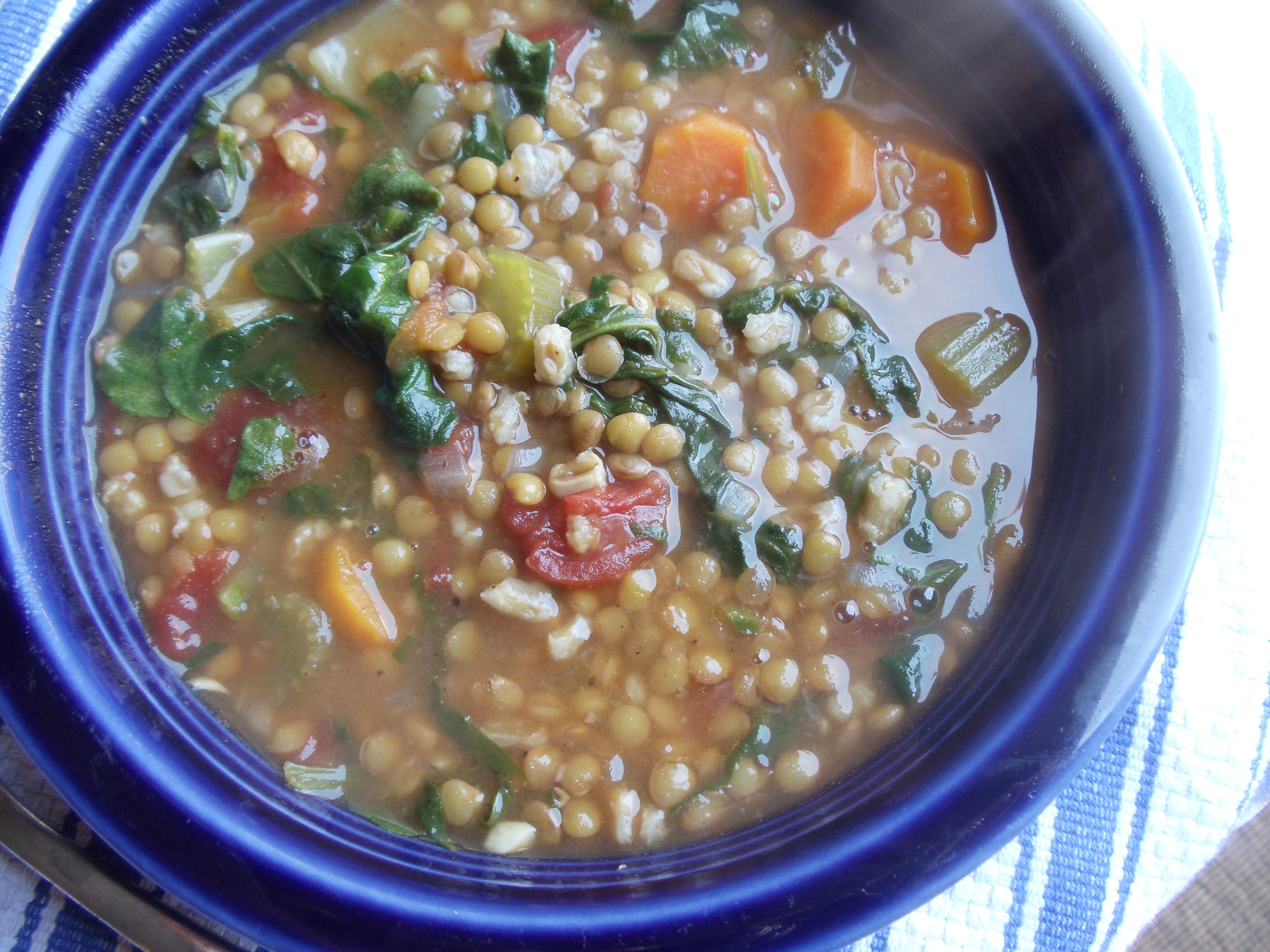 Heat a large stock pot, then add olive oil, carrots, celery, onions and garlic. Cook until vegetables soften, stirring occasionally, for about 7 minutes. Add the thyme stems, bay leaf and tomatoes, then cook another 5 minutes, until the herbs and tomatoes are very fragrant. Add the chicken stock and lentils, and bring to a boil, then reduce to a simmer. Taste the broth for seasoning, and add salt and pepper if needed. Simmer the lentils for about 20 minutes until they are tender, then stir in spinach leaves until wilted. Pull out the thyme leaves and bay leaves, season with additional salt and pepper if needed, then serve.