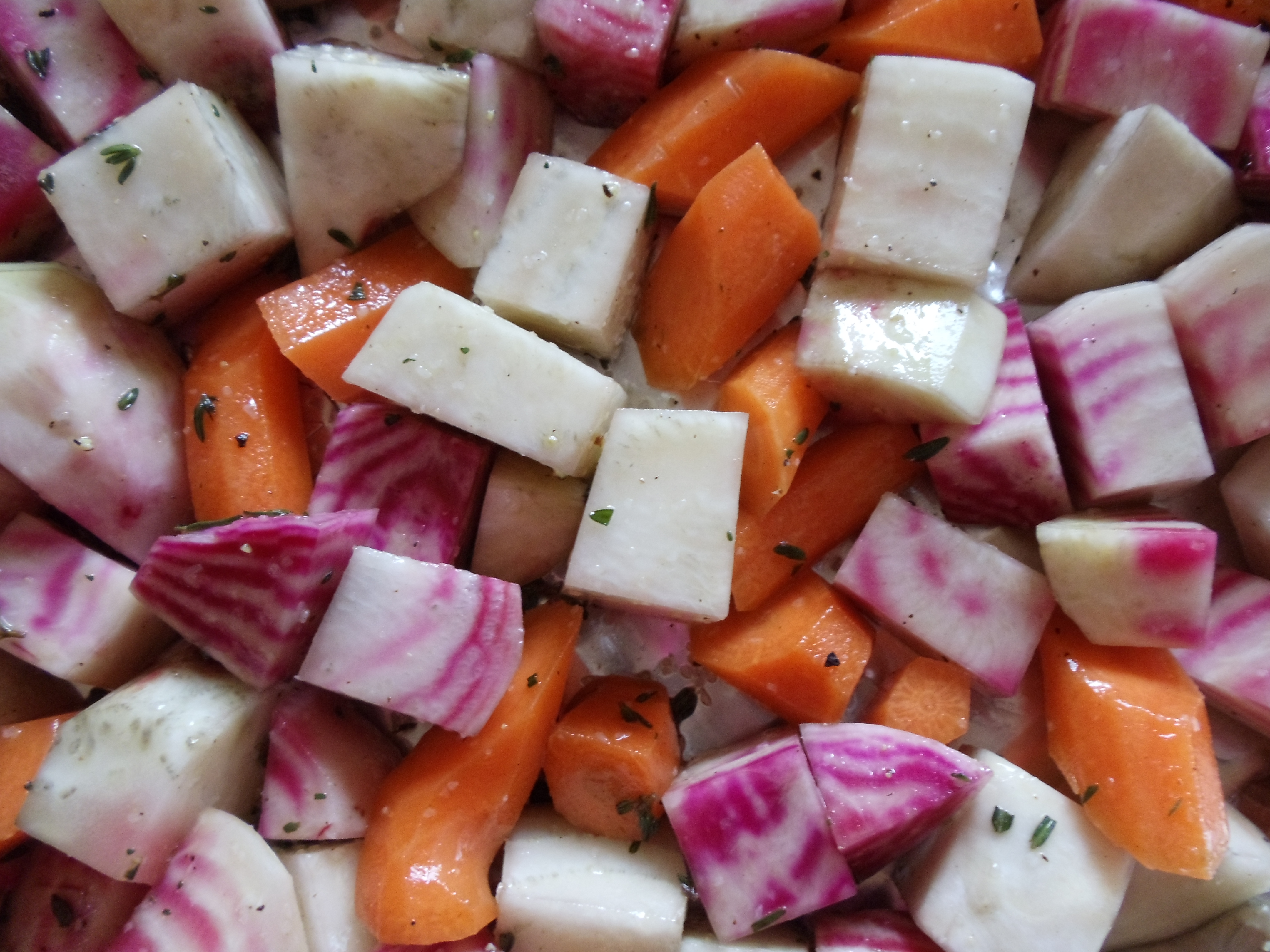 Once you get started, the options become endless. The easy part is paring the skin with a vegetable peeler (though that combined with chopping them can be not-so-easy on wrists, power through, they are worth it), then cutting them into chunks of equal size. Douse them in sufficient olive oil and enough salt and pepper to appeal to the eye, then tuck them into a 350 degree oven, turning every 10 minutes or so. For the most part, they will tell you when they are done, with a slight brown edge and a pucker of flesh, but you can also pierce them with a fork or paring knife, or better yet, eat a chunk. Most vegetables take 30-40 minutes, depending on the size of the cut.
