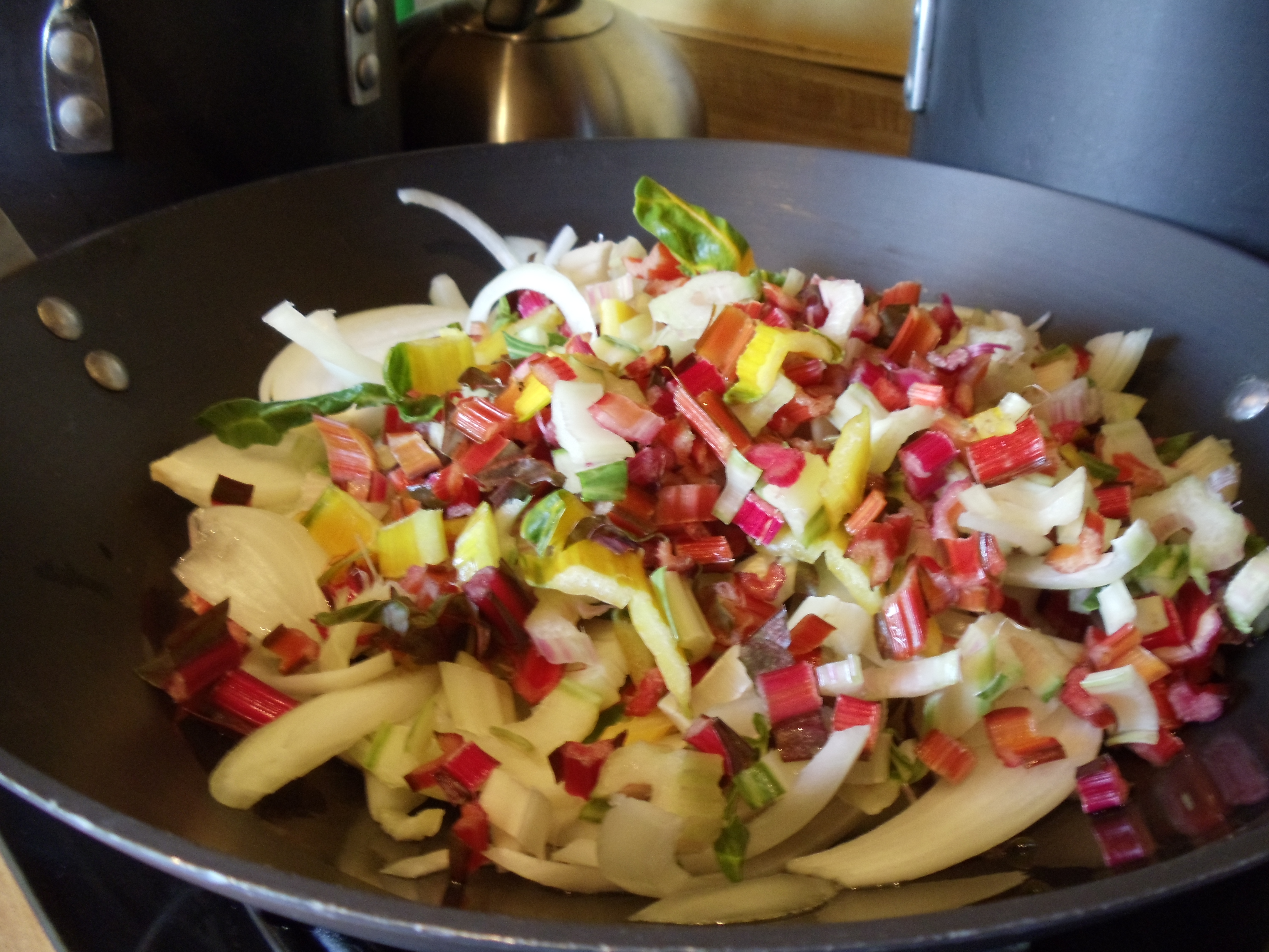 1 bunch of rainbow chard, ribs torn from the leaves, well washed