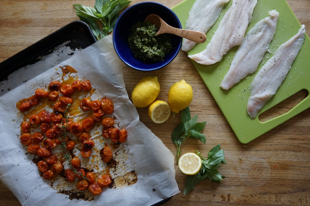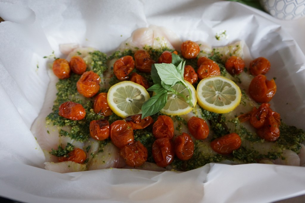Parchment Wrapped Sole with Roasted Cherry Tomatoes and Basil Pesto