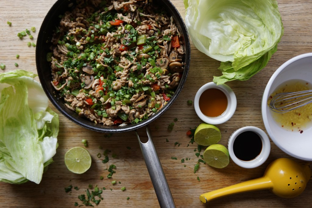 - 1 head of iceberg lettuce, core removed, leaves pulled apart to form cups