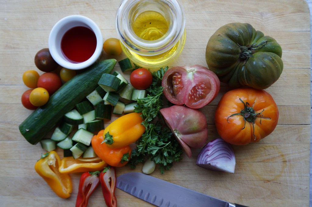 When it’s summertime and you find gorgeous heirloom tomatoes at the farmers market, what do you dream of making? Here’s an effortless, no-cook recipe that uses all of your fresh-from-the-garden produce, perfect for those heat-wave evenings.